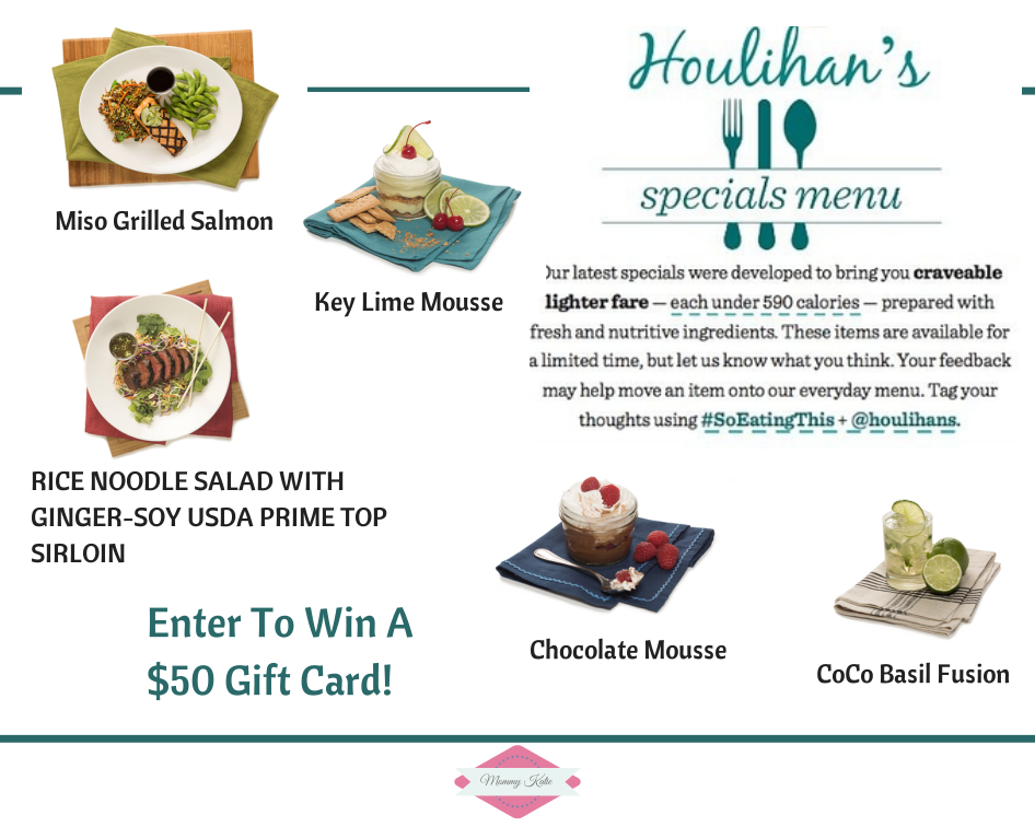 So if you are looking to find a place to head for during lunch or even dinner, that offers a selection of menu options that are on the lighter side of life, and that also do not sacrifice taste, then plan your next meal out at Houlihan’s! Well to get you prepared for your next time out at Houlihan’s, the wonderful people from Houlihan’s would like to give one of my amazing readers a $50 gift card!!