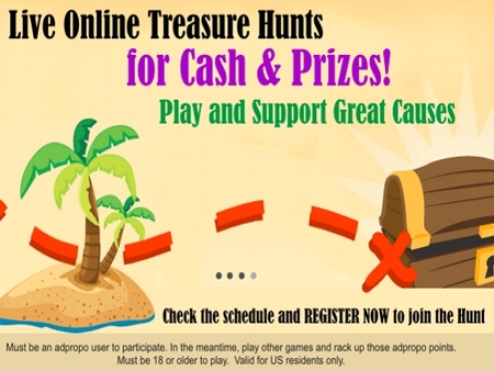 In the evenings, when dinner is over and the kids are getting ready to head to bed, I take advantage of that time to participate in online games and such. The thing is, I find games that I can get engaged in that I can actually win something from to be even more fun to participate in. Recently I was given an invite to join a site that takes the online gaming to a whole other level. The site is Adpropo.com and Adpropo.com is unlike any other gaming site I have been on. It is more than a game, you go on a treasure hunt in search of the prizes. You answer trivia questions from the sponsors, and with each list of questions, you get closer to the prize! Oh, and if you win the treasure hunt at the end, you can donate your winnings to some really great causes and charities!!!! Well, if this sounds appealing to you then mark your calender for tomorrow night at 9pm et, and join in on tomorrows treasure hunt where you will get the chance to win up to $1500 in prizes!!! In the mean time sign up today so you can also get reminders on tomorrows event as well as other upcoming events where there are also great prizes up on future hunts!!