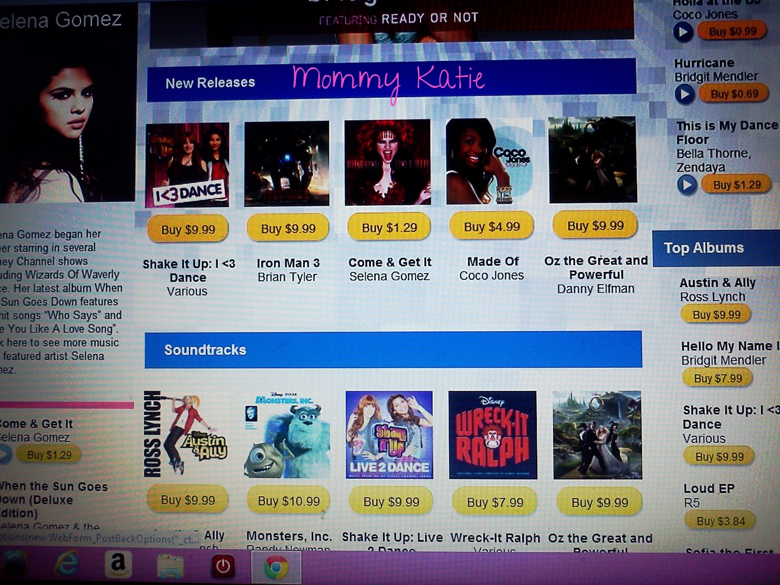The site is from Disney, it is the Disney Music Store, and it has all of the great music that she loves from the Disney Channel that are hits and they are songs that I feel comfortable with her listening to as well. She can listen to a range from the Disney Princess songs to the top pop songs like from Selena Gomez and others! Oh, and for her to get her songs, all I or anyone else who wants to get her some songs has to do is purchase a Disney Music Gift Card for her to use on the site! Also, her account is set up to my email, so when she goes on, I can monitor what songs she buys and listens to.