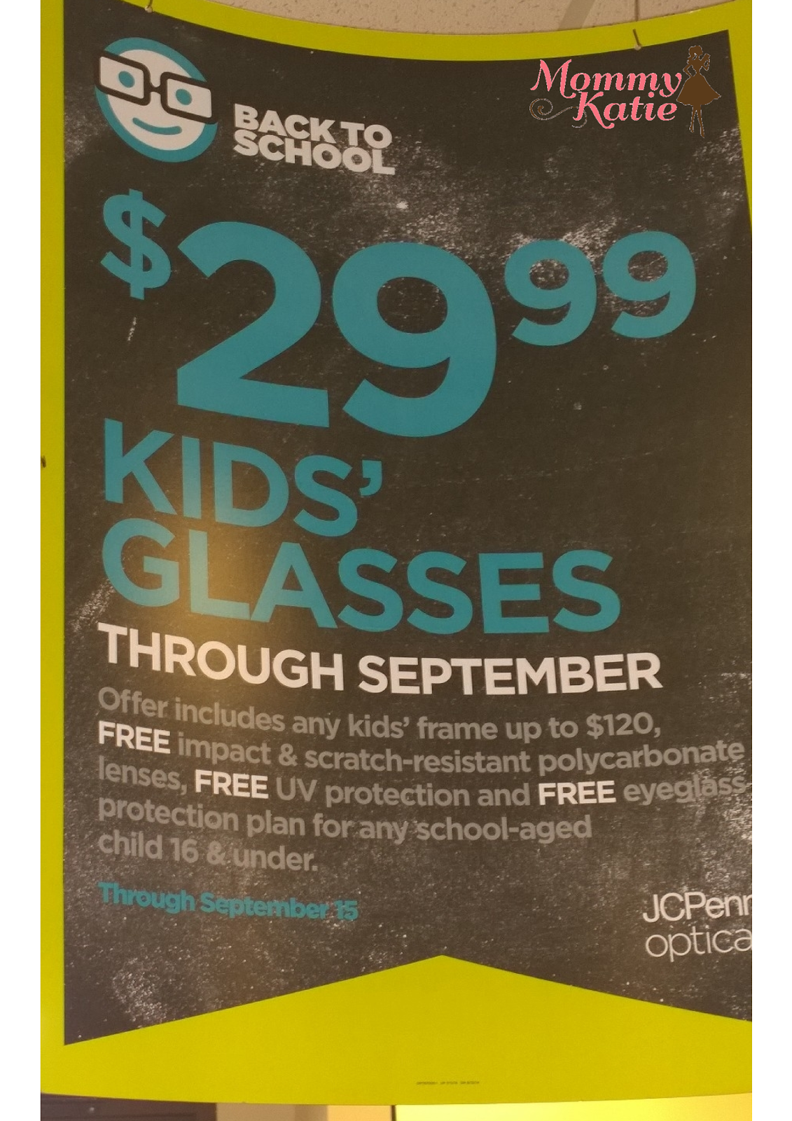 With this promotion, you can take your children, school aged 16 and under, to your local JCPenney Optical, with your child’s eye glasses prescription, and get a pair of glasses, any pair, under $120, for just $29.99!!! This price includes the frame of choice, which does not have to be a kids frame style, opening the doors for a large range of frames to choose from, FREE impact & scratch-resistant polycarbonate lenses, FREE UV protection and FREE eyeglass protection plan!