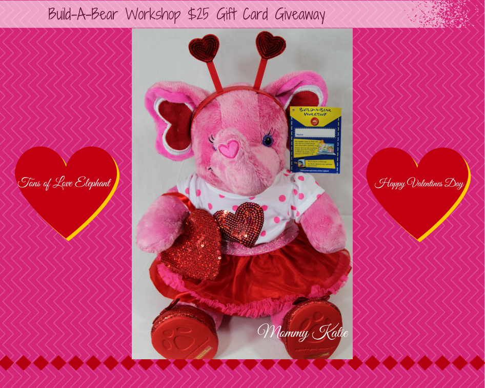 Estrella’s favorite animal is a elephant, so when I was given the chance to pick out a Build-A-Bear Workshop friend to review for Valentines Day, I found this adorable elephant to be the one! Aside from being Estrella’s favorite animal, Tons of Love Elephant is pink, which is also among the faves with Estrella! Tons of Love Elephant is soft and cuddly, fitting right in with the rest of Estrella’s adorable Build-A-Bear collection of soft, lovable and cuddly friends! The adorable elephant I was sent for this Valentines Day also came fully dressed with a very cute sequined heart antenna, a pair of red sparkle bow flats, red heart sequin purse, and a very adorable Valentines Day shirt and skirt combo! Over at Build-A-Bear Workshop, I can find a great selection of friends to choose from for each of my kids, and with the many accessories, I can personalize their friends as well and ready them to be great gifts to give this Valentines Day! So this year, if you are looking for a stuffed animal friend to give your kids or the loves on your list, be sure to check out the very soft, cuddly, and very adorable friends from the Build-A-Bear Workshop! Well, since Valentines Day is coming up, the wonderful people from Build-A-Bear Workshop would like to give one of my readers a $25 gift card!