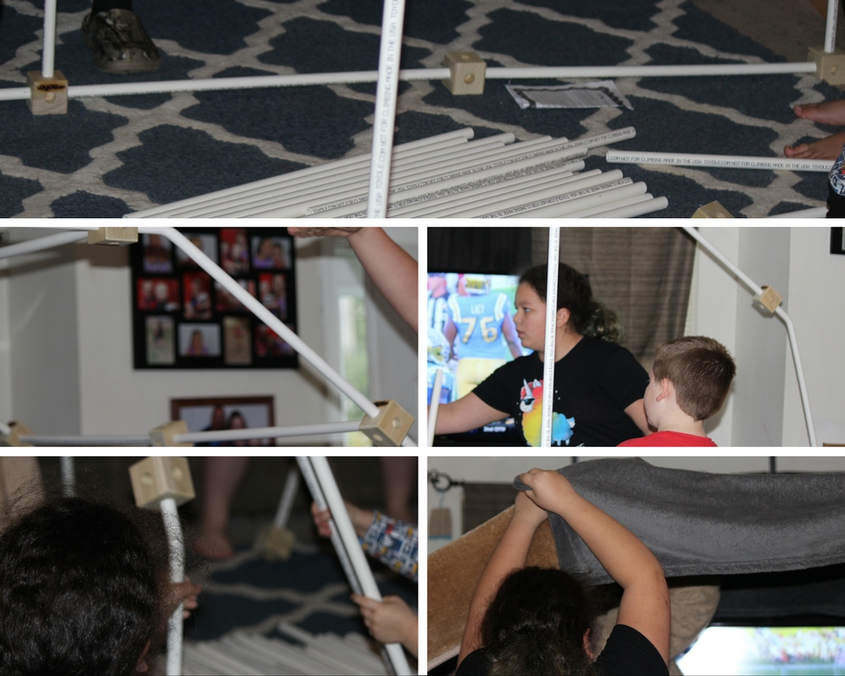 We found that the various pieces could go together in a number of ways and that they also went together nicely, allowing the kids to put the poles in the blocks as they went along to secure the various angles they built. After they got their fort to where they wanted it, they then put blankets on it to give it that fun playhouse feel. We used blankets that we had in a closet and were able to secure them in place with the clamps that came with our kit. And once the fort was up and ready to be used, the kids took full advantage of it! We had set up the fort in the family room, and allowed the kids to have the opening face the television, giving them a fun way to watch a movie and play together while it was raining outside.