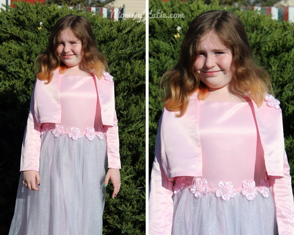 After looking over the selection of dresses available at Noori Dresses, I decided to go with the Pink Satin Dress with Flowers for my daughter Megan to wear this coming holiday season! I’m in awe of how pretty this dress is and I just knew Megan would love it! This dress is made of 100% polyester. The tulle like skirt around it is sparkling with lots of glitter, which Megan really likes. Along with the dress, we were also sent a very nice bolero that looks really nice with this dress. The little matching jacket is perfect for the fall weather and will also look very nice when we do our holiday pictures this year.
