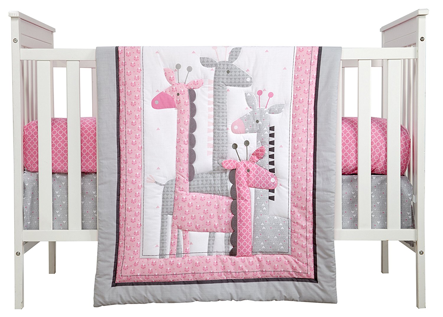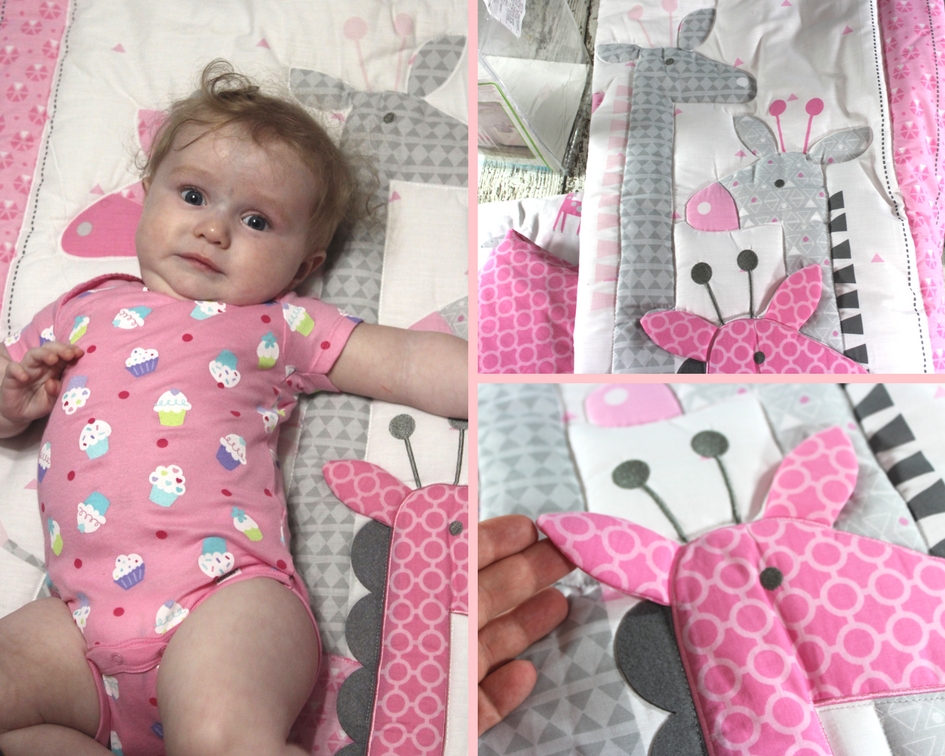 First let me start by saying I was so happy when we received this bed set for Zoey! It fits in perfectly with our theme of giraffes, elephants, and zebras, and of course it’s pink! This is a 4 piece bedding set that includes 2 fitted sheets, 1 dust ruffle, and 1 appliquéd comforter. The comforter has pink and grey giraffes with a pink and grey boarder. Zoey likes to rub her hands over the texture of them which is soothing for her when we put her down to sleep. I like that one of the crib sheets is little pink and grey giraffes with hearts and the other is a dark pink with white circles giving the set a very pretty contrast that goes great with the comforter. Both crib sheets are fitted and have elastic around them for a snug fit on a standard mattress, allowing us to change them out as needed. The dust ruffle is grey with little white triangles,white dots, and pink dots, which also helps to really make this set stand out!