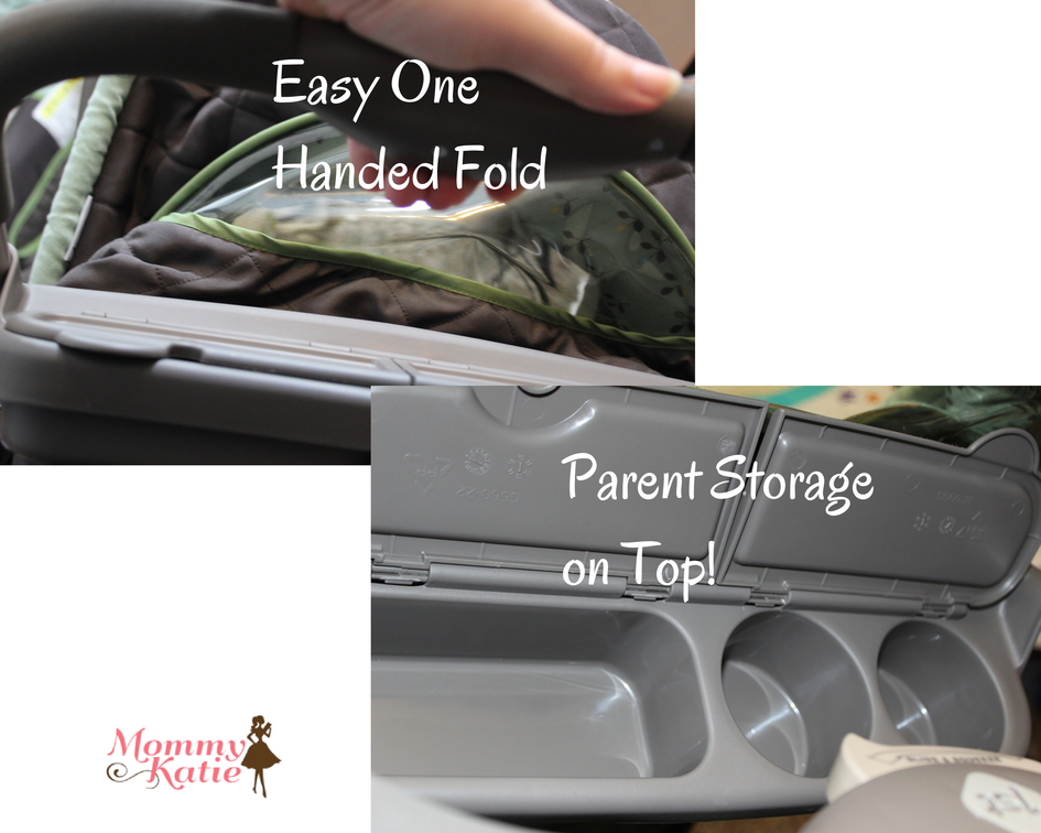 For the stroller, I think one of the aspects I really like and can appreciate is that when baby is sleeping in the car, I can hook the car seat up to the stroller, and keep from waking a sleeping baby when getting in and out of the car with the QuickClick, which attaches the car seat and secures it in place on the stroller. The one hand fold is also a plus, for busy parents, especially when traveling and juggling 3 older kids, and the lightweight frame helps when taking the stroller in and out when we are on the go. Then with the handy parent compartments, I can open them up to put my phone, keys and even hold 2 drinks in, when needed. The large storage basket on the bottom comes in handy for carrying the diaper bag, and also very handy for when we are out shopping to store all of our items in.