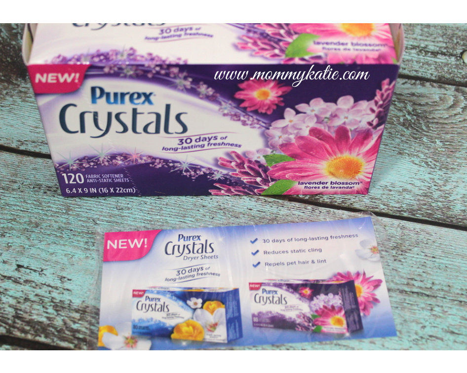 Recently I was sent some new dryer sheets from Purex to review. I was sent the new Purex Crystals Dryer Sheets in the Lavender Blossoms scent! With these dryer sheets, I can not only appreciate the pleasant, fresh scent, that lasts for up to 30 days after putting the laundry up, but I can also appreciate that these dryer sheets help eliminate that annoying static that can occur after putting the clothes in the dryer.