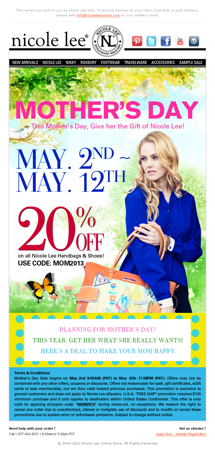 Is it bad of me to say that I look forward to Mothers Day each year? I honestly love to be pampered, and I know that when Mothers Day comes, which is only once a year, my husband and kids will pamper me and just me, so yes, I look forward to this day. I look forward to the awesome little cards that the kids make me, they are so adorable, and I know that they put so much thought and time into them. I also know, that if I get up before my breakfast is ready and served to me, I better not even think about letting any one in the house know or else the kids will be devastated because just like those special cards they make, they also put a lot of thought and planning into the the morning and breakfast for me. Aside from the morning that the kids usually take control of, there is my husband, who sometimes needs a little bit of help when it comes to finding that perfect gift for me. It is not that he does not try, but he does need a hint every now and again and I am not one to be to subtle when it comes to the hints. Well, I am one that loves my purses, and I am very blunt when it comes to letting my husband know which purses I like. One place that I have adored shopping at when it comes to purses is Nicole Lee, they have the cutest and hottest trends out there and my husband does not have to feel awkward about going shopping for me, he can just go online and get the purses that I like! Another great thing about Nicole Lee when my husband goes shopping on their site this Mothers Day is that he can get 20% off right now through May 12th when he uses the coupon code MOM2013!
