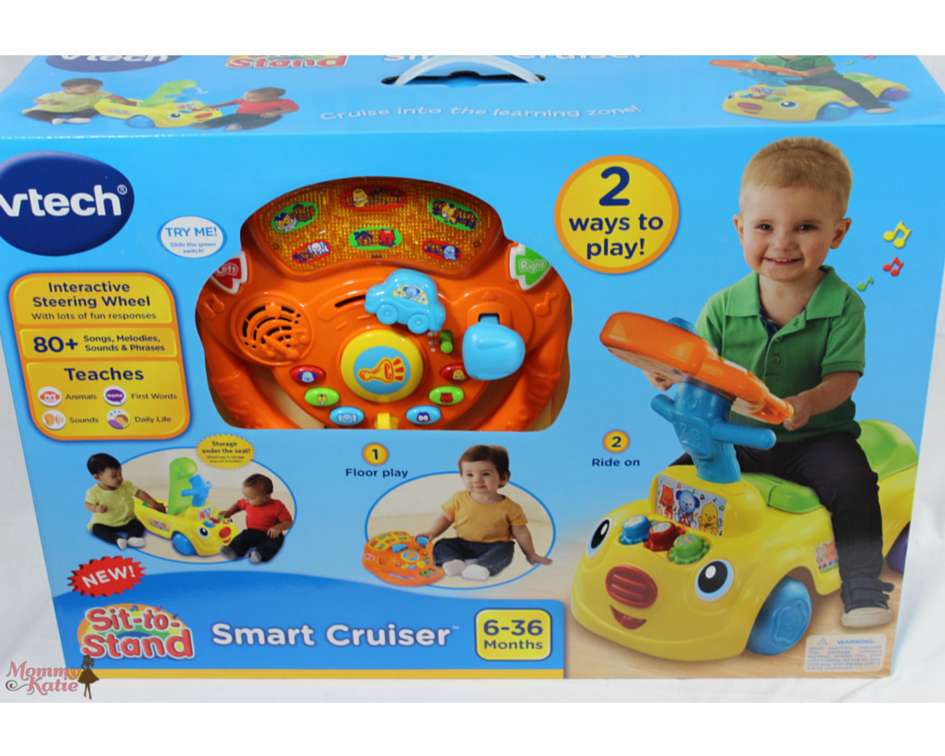 As my little guy drives and plays with the steering wheel, he can shift gears, honk the horn and even to realistic driving sound effects as he vrooms along! There are 6 different locations that he can choose to drive to. I also like that he can use the under seat storage, so he can take some of his other fun toys with him as he is on the go with his Vtech Sit-to-Stand Smart Cruiser, making this a great riding toy to get your busy little toddler!