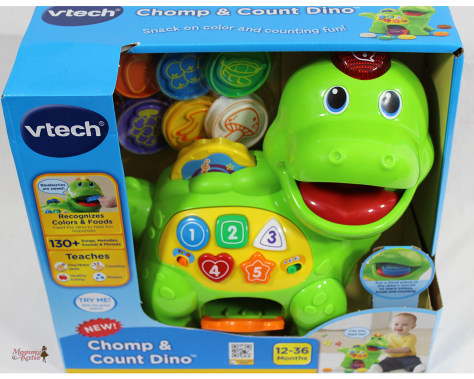 With the Chomp & Count Dino we can feed the hungry dino and listen as he recognizes the pieces. I like that this toy teaches colors and numbers, and that it provides endless fun for toddlers. We can switch back and forth with the counting mode and the food modes, while we listen to the words and phrases the dino says as he teaches colors, numbers, shapes and more, making the Chomp & Count Dino a great toy for the toddler in your life!