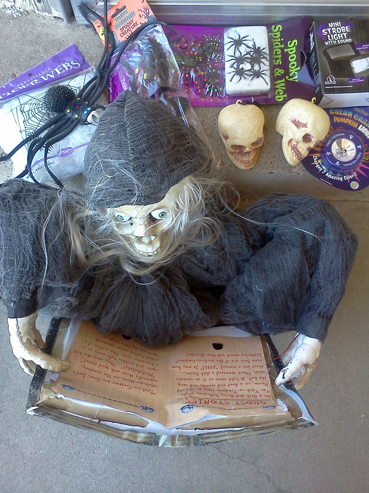 I went with the Animated Story Teller Skeleton. This animated prop is good and scary, and when he is activated he tells some scary stories to those who are willing to stick around and listen!! I also went with some of our yearly basics which included some spider webs, several different types of creepy spiders to go in the webs, a light for our pumpkin, a mini strobe light to give the night some really great spooky effects, and a couple little skulls to hang up as well!! This pack is going to be a great addition to our yearly Halloween decor set up!!