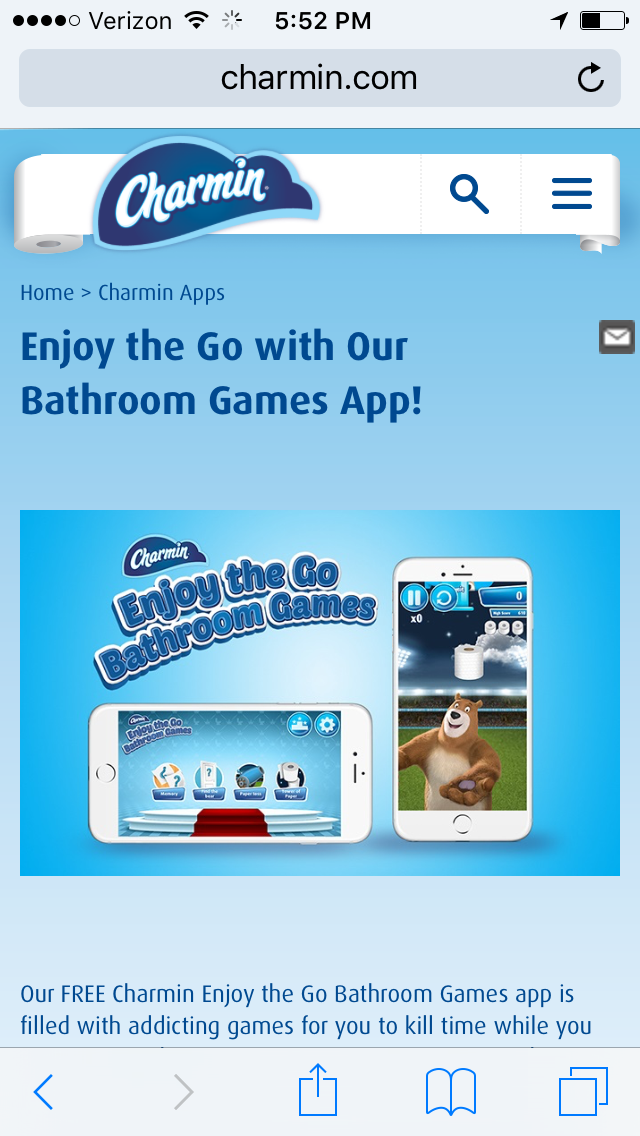 I found that with this app, I can share it with everyone who comes to our house this holiday season, and when it comes time to take that time to enjoy the go, we can escape to the bathroom and play some fun bathroom games on the Charmin App!