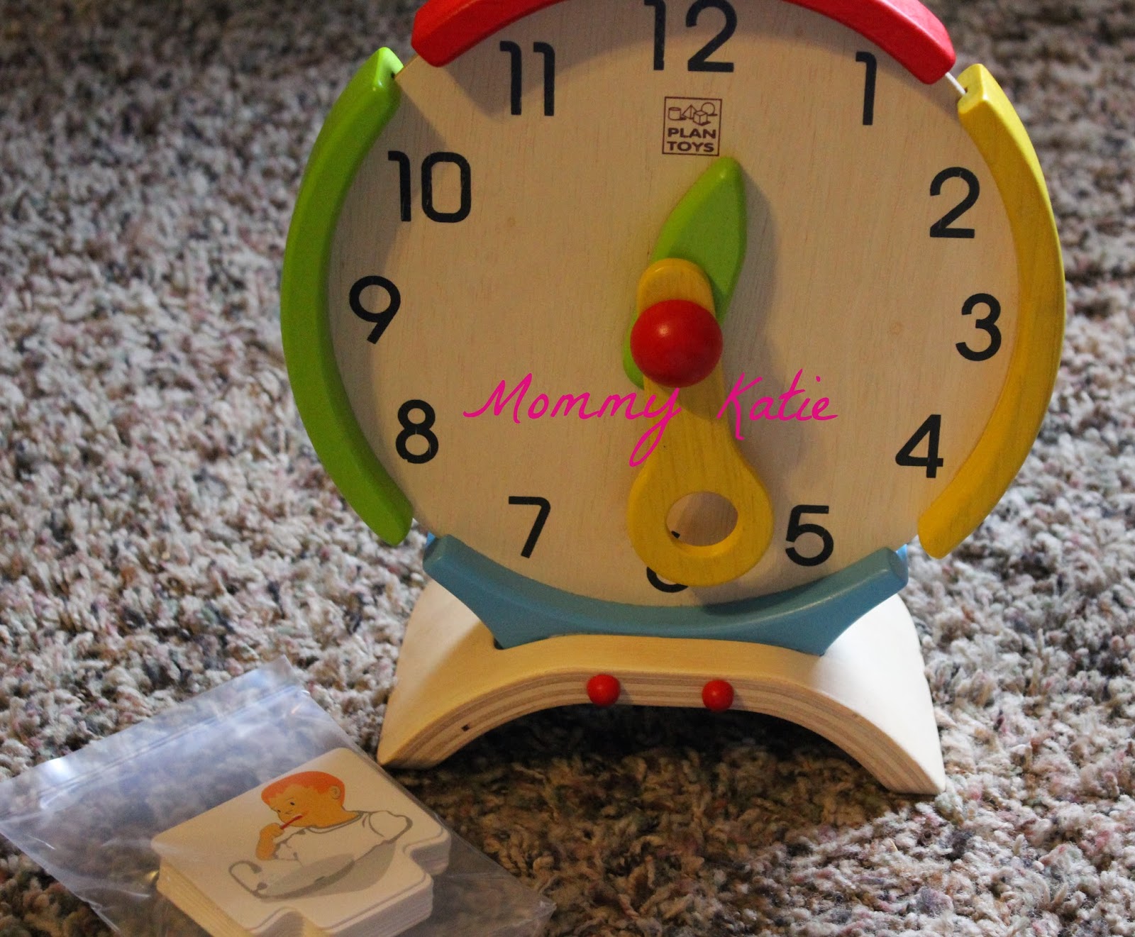 For my two older kids, I was sent the Activity Clock. This is a great toy, for not only play, but for also learning how to tell time. The clock comes with a set of cards, marking the daily activities of my kids. You place a activity card in the top of the clock, and set the time for that activity, showing the kids what time they will be doing that particular activity. Or you can play a game, by placing cards in no particular order, and getting the kids to match the correct time for that activity. This is not only great for helping them learn how to tell time, but also great for putting forth schedules for my kids. I can set the clock with their particular activity, then they know what time we will be doing that, and they can watch the clock on the wall for it to match up to the time on the Activity Clock.