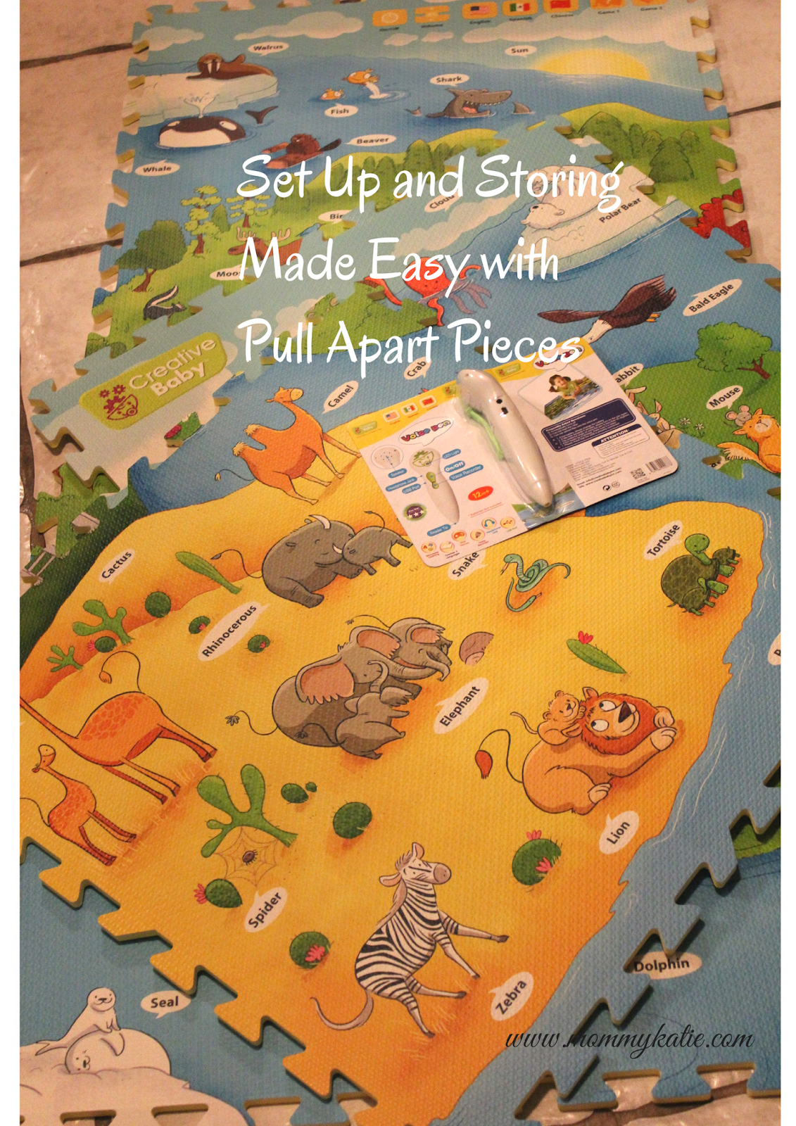 Once we got it put together, I realized that with this one mat, my youngest and I, and even other family members, can enjoy playtime, interacting with and exploring all of the animals and activities on this mat. I also like that the mat is made of soft foam, so we can all enjoy the interactive fun, but also stay comfortable while playing on the hard surfaced floors! The set we got came with the Voice Pen, which is what brings the i-Mat: My Animal World, to life!