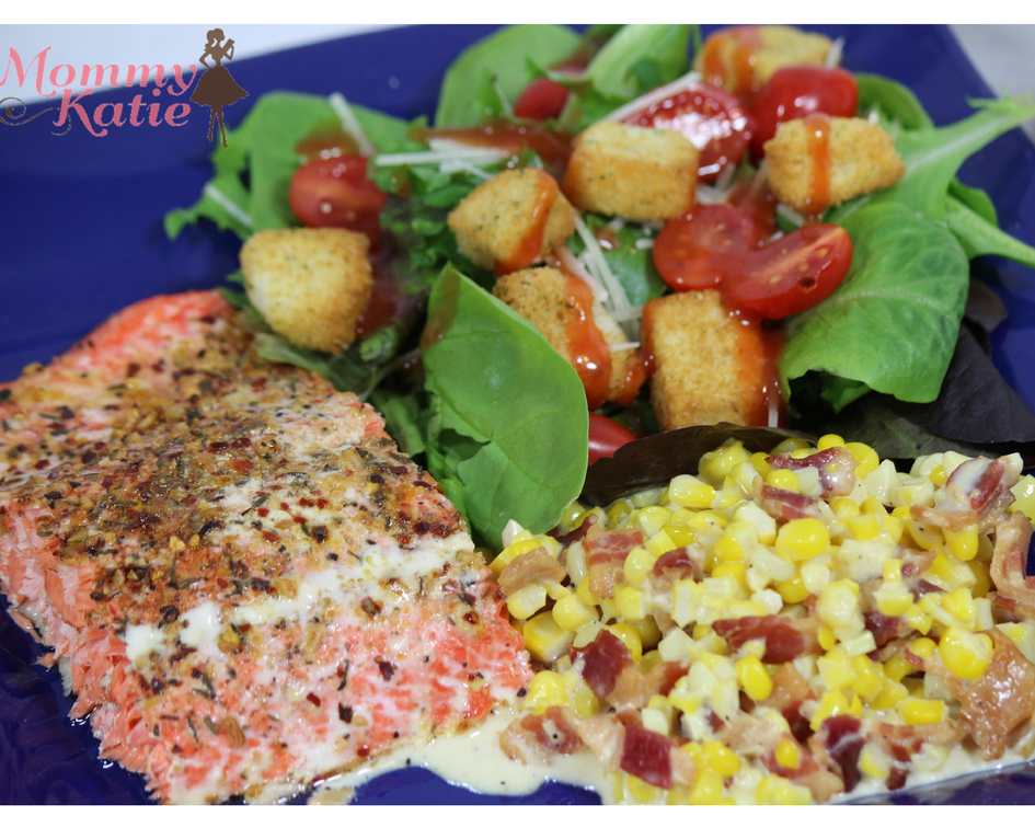 With the summer here, when I think of fun, home cooked meals, I think of seafood recipes. The summer reminds me of the beach, and when we are at or near a beach, we tend to indulge in the local seafood dishes. When I started thinking of a dish, I wanted to do something fresh, with a pleasant kick to it, so I decided to go with the Mrs. Dash Caribbean Citrus Seasoning Blend. The end result, I got a plate with seasoned salmon, creamed corn with bacon, and a fresh garden salad!