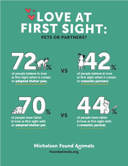 Do you believe in love at first sight? An overwhelming number of people do …when it comes to adopted pets, that is. While less than half believe it can happen with a partner, 70% have experienced love at first sight firsthand with a pet. In honor of National Adopt A Shelter Pet Day (April 30), Michelson Found Animals Foundation conducted a Survey Monkey survey of 1,000 people – below are the findings: