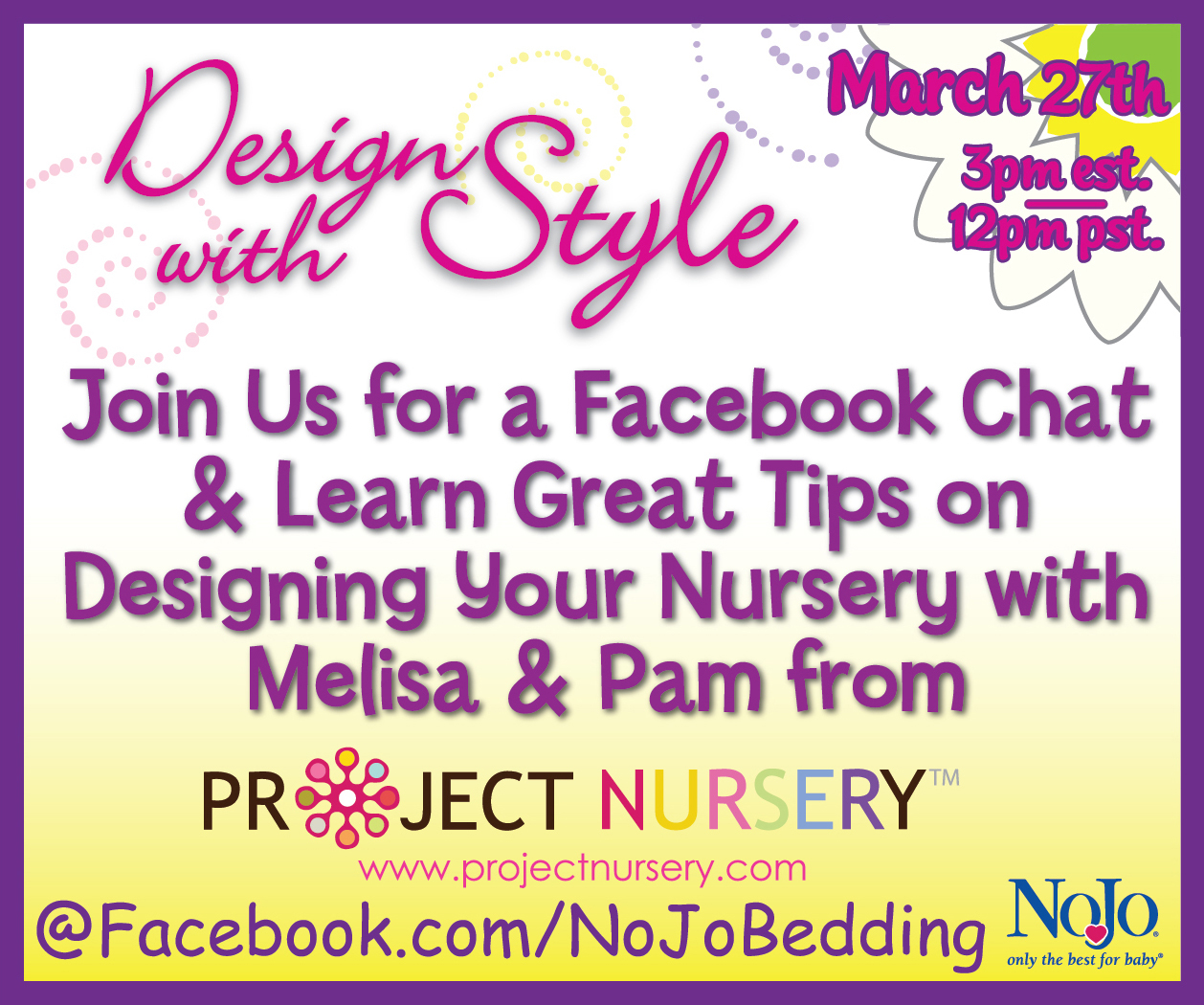 NoJo is hosting a Facebook Chat on March 27th at 3pm est. The topic is Designing Your Nursery: Getting Started. Our guests will be Melisa Fluhr and Pam Ginocchio from Project Nursery.