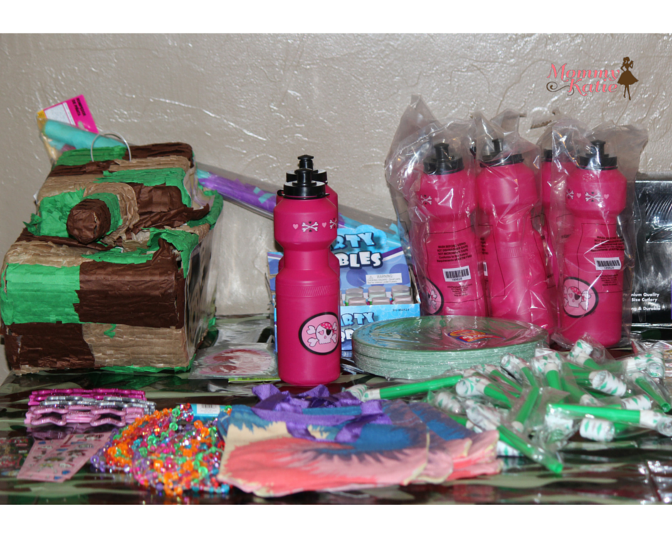 I loved the water bottles I came across for the girls, along with the tie dye bags, so the girls could carry their party goodies in. Along with the goodies for the girls, we found some fun necklaces to add to their favor bags. Then for both boys and girls, I liked the green blowouts and bubbles we found, giving the kids noise makers and bubbles to play with during our party.