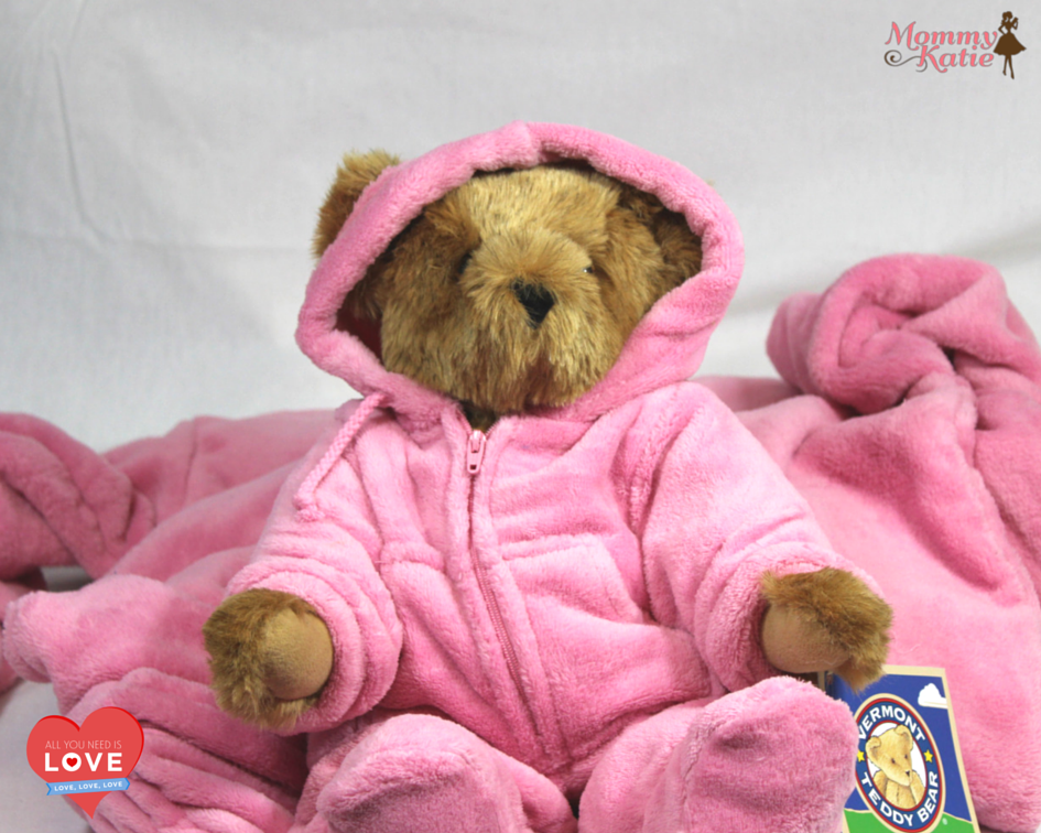 With the love in the air and the Valentines Day just around the corner, I find myself in search of those gifts that are meaningful and that show the ones you love and care about how much they mean to you. One family of companies that we have adored in the past when it comes to sending those we love and showing how much we care, even when we are across the country from one another is the Vermont Teddy Bear Company which also has those adorable Pajamagrams! So when we were sent a soft, comfortable Hoodie-Footie with matching Vermont Teddy Bear to review, we were very excited to check them out!