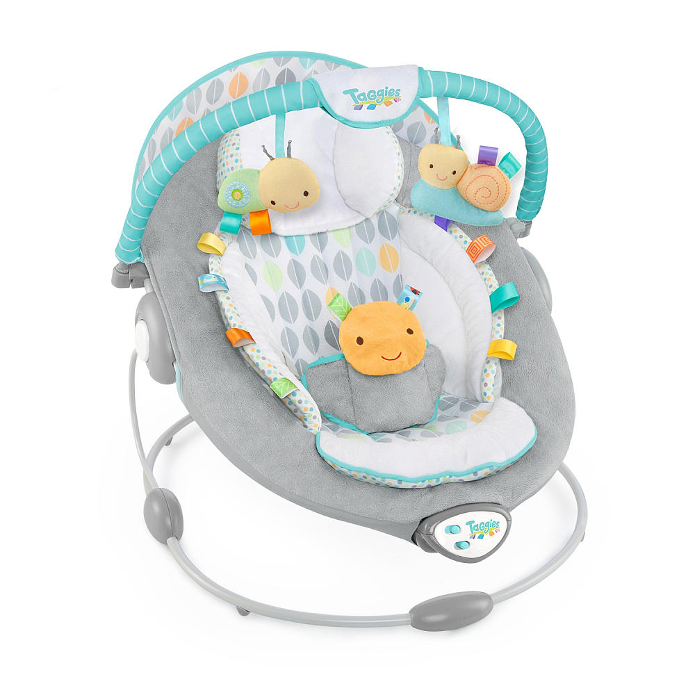 With this bedding set, I find that it can make a perfect addition to any nursery, whether it be for a baby boy or girl. The colors are neutral and the theme is one that can really go with a combination of nursery themes, from a jungle theme to a baby animals theme. I love that when Wyatt lays down, he can self soothe with the soft silky Taggies that are on the animals on his blanket! You can find this adorable Taggies Bedding set as well as the coordinating pieces at Target today! Also, to go along with this adorable Fun in the Jungle Taggies 3 Piece Bedding Set, I was sent the new Taggies Soft N’ Snug Bouncer to review. Wyatt may be a little big for this bouncer, but my friend who is expecting a baby boy in just a couple of months, found this bouncer to be great to go along with the other baby boy items she is putting together for her new baby! Just like the bedding set, the Taggies Bouncer has those silky soft tags, which babies love to rub their fingers on to self soothe. The fabric on this bouncer is very soft, and with the 2 reclining positions, baby is sure to get comfortable when you place them in this bouncer. This bouncer features 7 songs, volume control and auto shut off. Then with the toys that hang from the bar, baby can entertain themselves while relaxing and listening to the music!