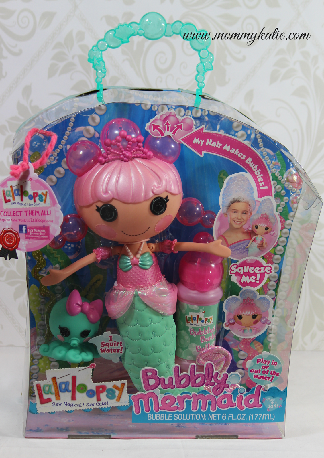 The Mermaid doll is easy to fill with the bubble solution, and once filled, give her tail a squeeze and the bubbles will come out of her hair! And for some fun water play fun, her adorable little octopus friend squirts water!