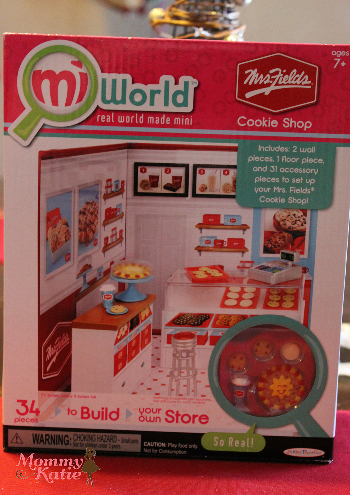 Then for my daughter, who has a love for the miWorld collection, we were sent the Mrs. Fields Cookie Shop! Being a huge fan of the Mrs. Fields treats, my daughter can recreate those treats right from her own little cookie store. The miWorld Mrs. Fields starter set comes with 2 walls, 1 floor, over 34 accessories which include treats, drinks, and more! This set also comes with a sticker sheet, so my daughter can customize her store! Making the miWorld Mrs. Fields Cookie Shop a great gift to give and add to your kids miWorld collections!