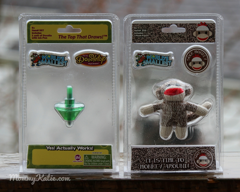 I like that with the Doodle Top, you find that iconic Doodle Top that kids love to play with and spin on the paper to create fun designs with, but in a mini pocket sized version. I also like that with the Sock Monkey, you get a very adorable sock monkey that is also fun to add to any miniature collection, that is also pocket sized! Making these toys along with others you can find from Worlds Smallest collection, a great collection to get your kids!